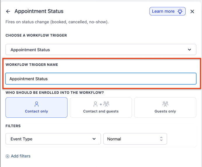 Choosing a clear and descriptive name for your trigger helps keep workflows organized and easy to manage. Instead of leaving it as the default “Appointment Status,” name it based on its purpose. For example, if the workflow is designed to send follow-up emails after an appointment, you can name it “Appointment Follow-Up Trigger.” Similarly, if it’s meant to notify staff when an appointment is canceled, you might call it “Canceled Appointment Alert.”
