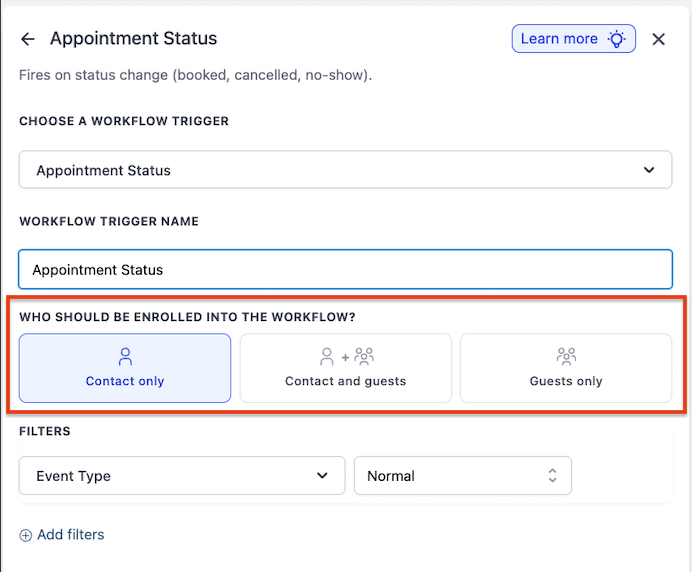 Yes, by selecting the “Appointment Status Is” filter and choosing 'Cancelled', for cancelled appointments. When you reschedule an appointment, it’s treated as a new one. The contact will re-enter the workflow from the beginning.