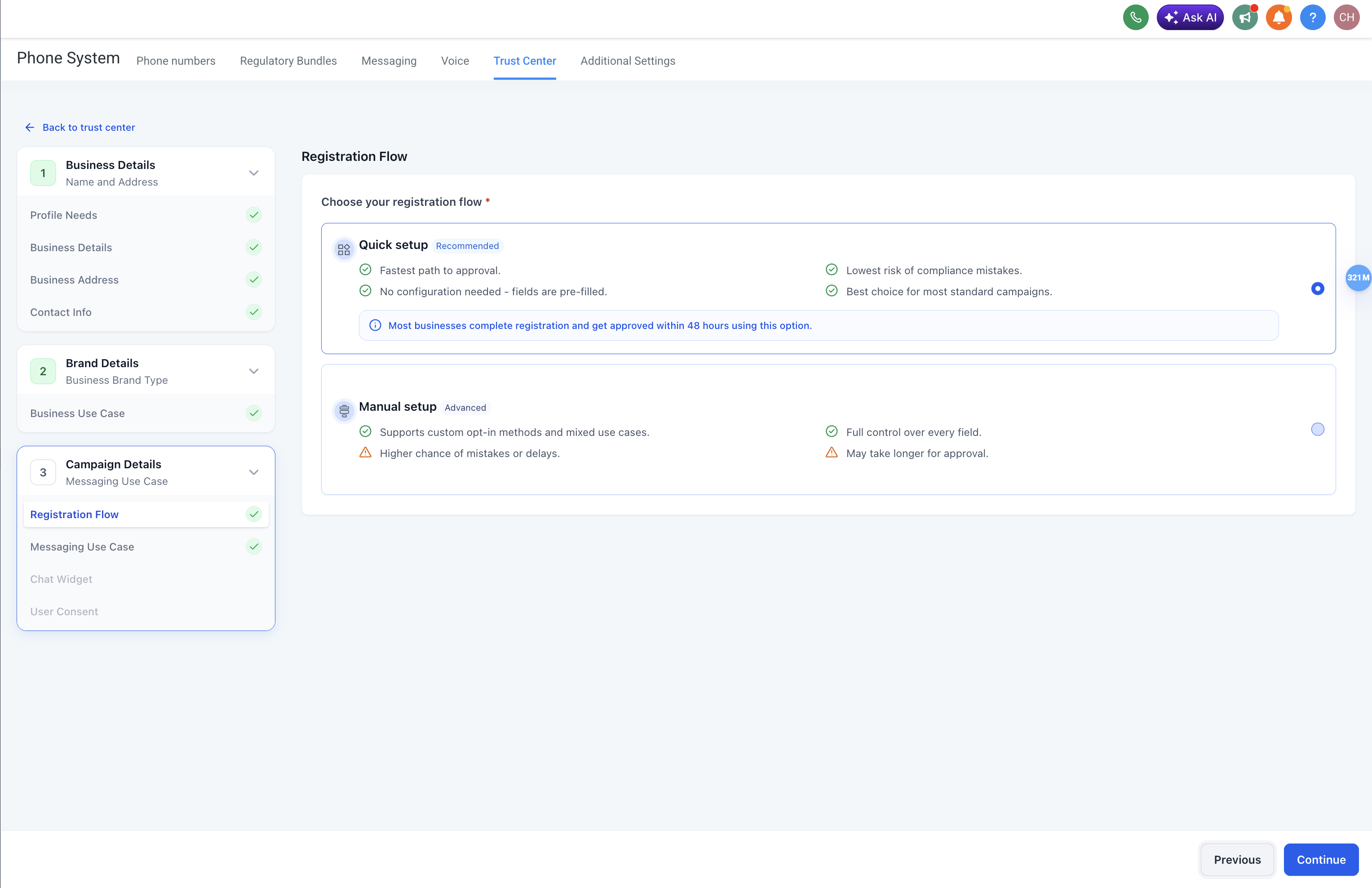 Users can now select “Quick Setup” when starting Campaign Registration in the Standard A2P flow.