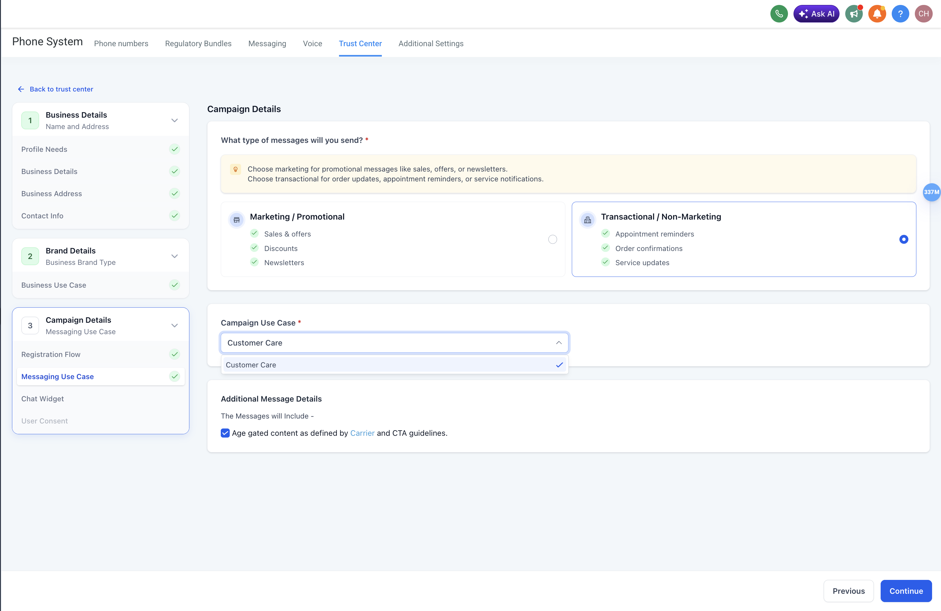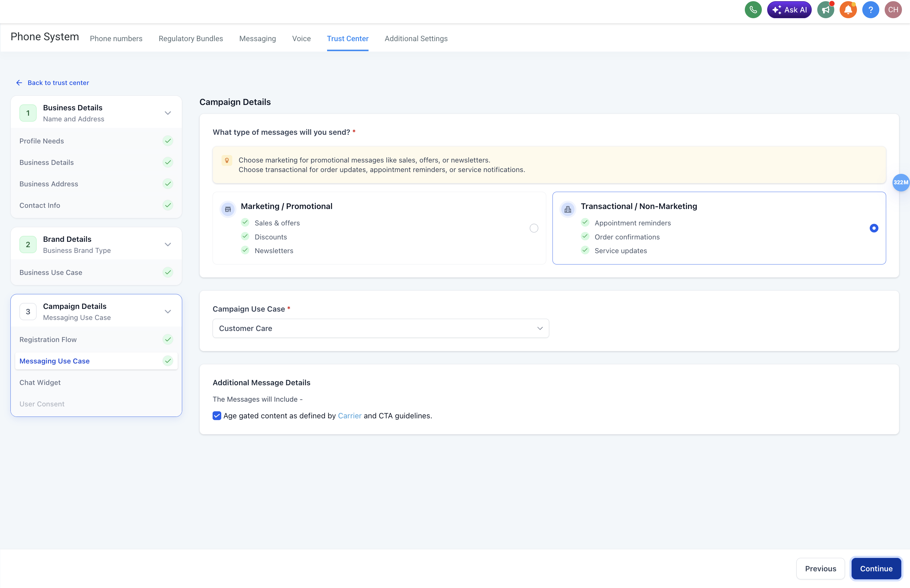 Messaging Use Case Selection defines the type of messages your campaign will send and determines how the campaign is categorized during registration.