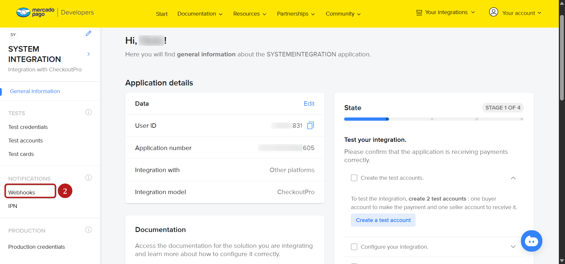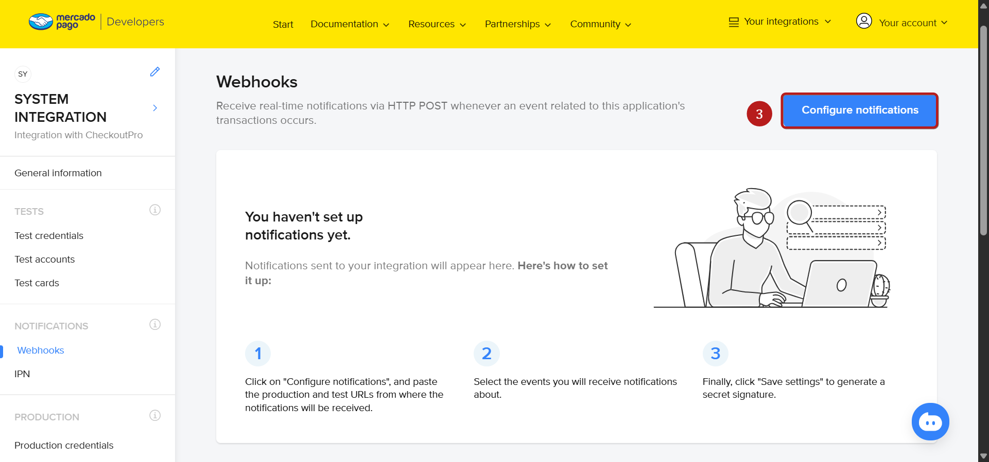 Some Mercado Pago integrations require webhook notifications so payment events can sync correctly back to your platform. Log in to your Mercado Pago account and go to the developer panel (https://www.mercadopago.com.br/developers/en)