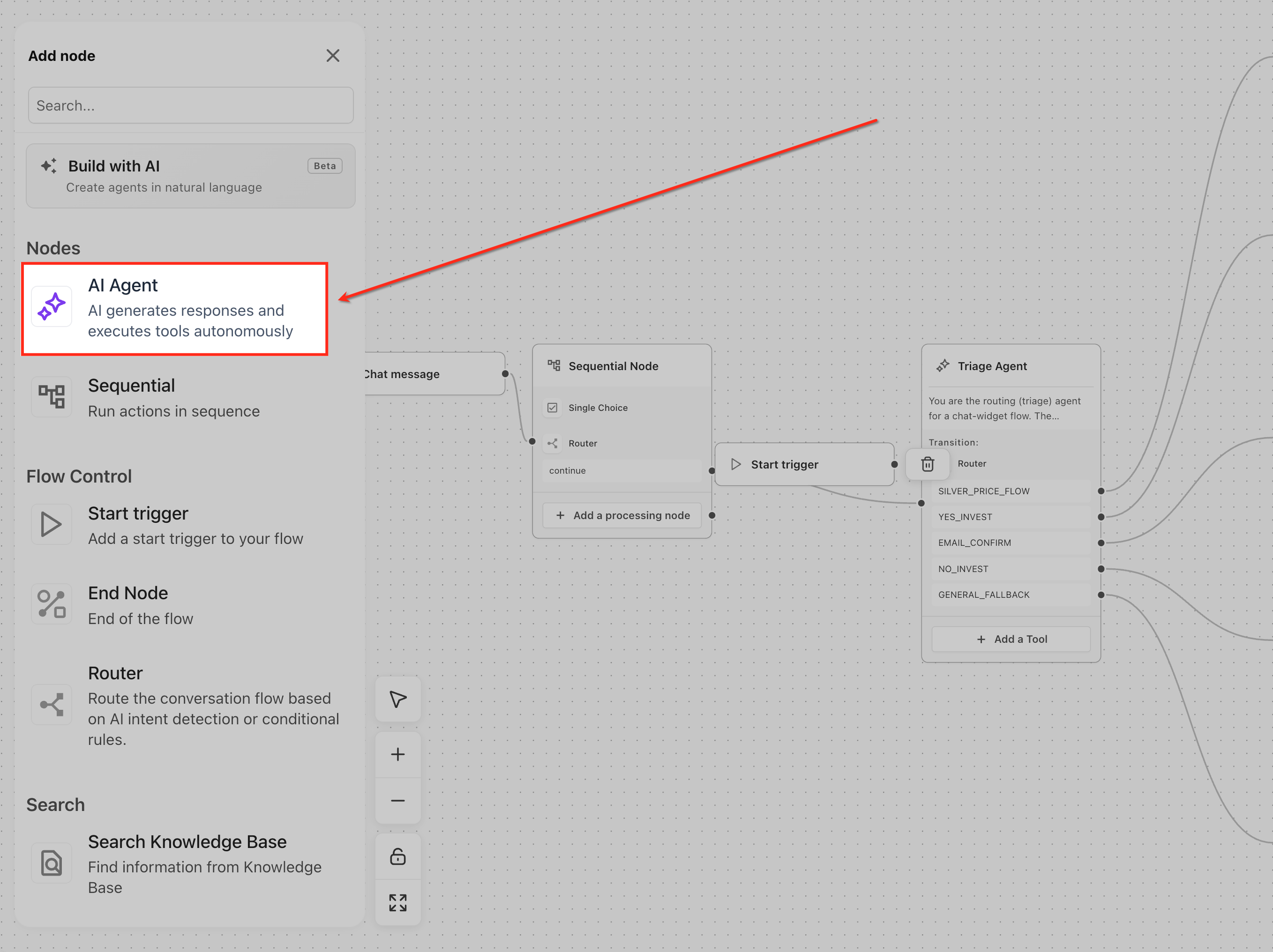 Open the Nodes panel in Agent Studio and add the AI Agent Node to your agent flow. Place it on the canvas and connect it to a Start Trigger or a previous node.