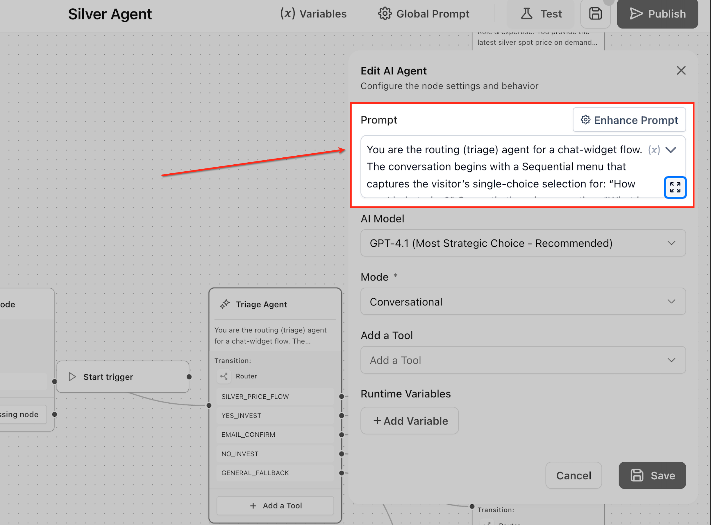 In the configuration panel, enter a clear and structured prompt. Specify the agent’s role, responsibilities, tone, and when it should use tools. This defines how the agent will behave during execution.