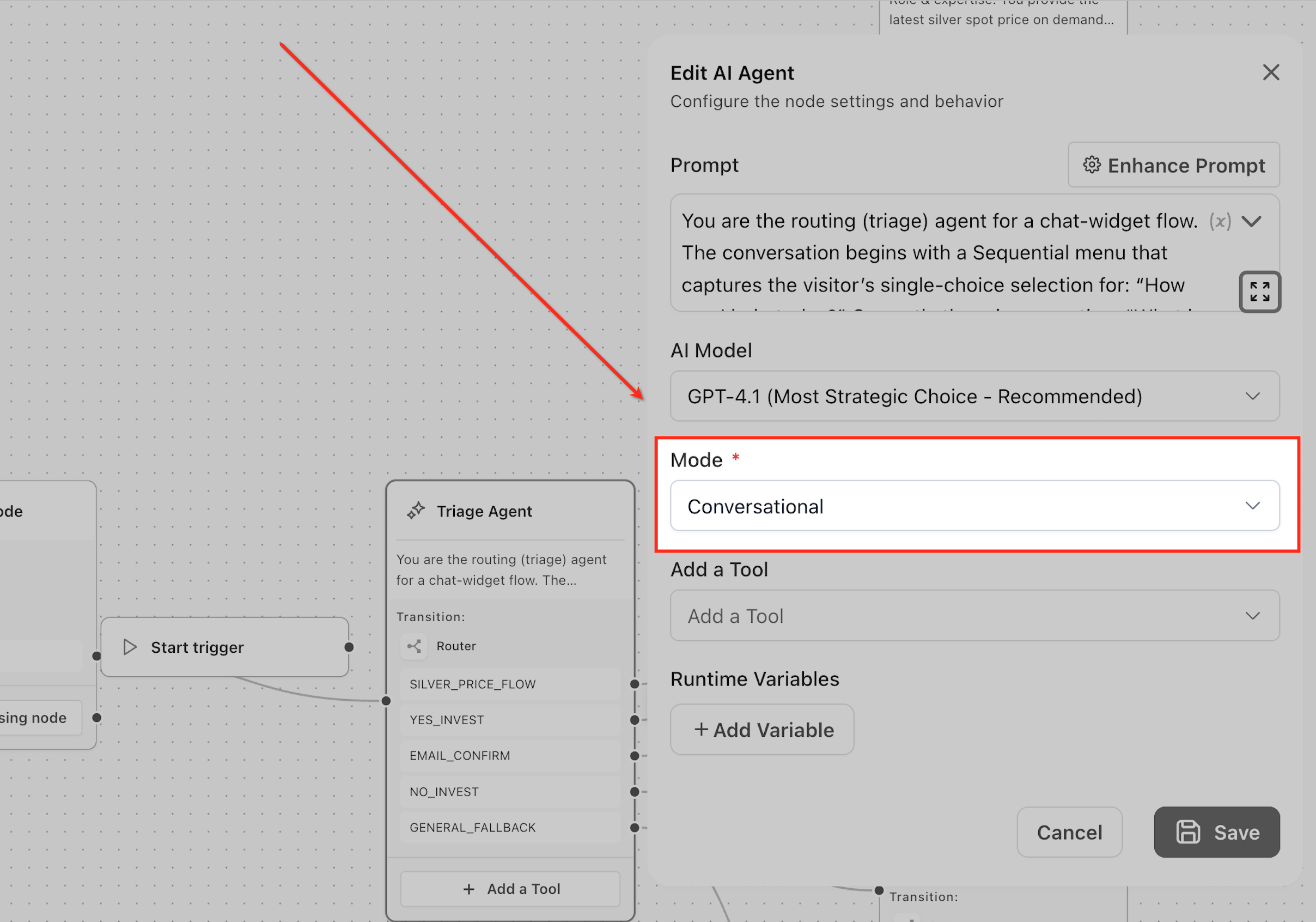 Mode defines how the AI Agent Node operates—whether it communicates with users or executes tasks silently. In Conversational Mode, the agent responds and handles interactions, while in Task Based Mode, it performs actions without generating user-facing responses.
