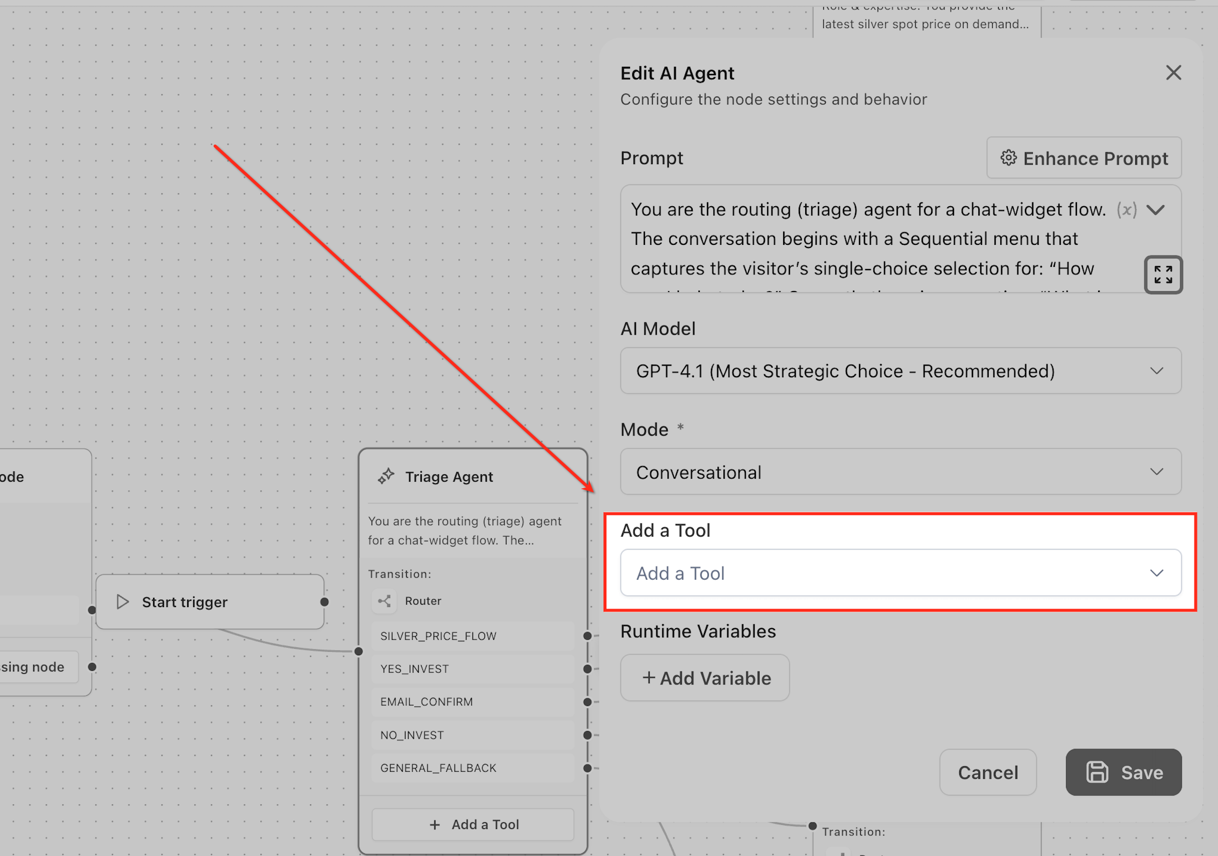 The AI Agent makes this decision based on the prompt instructions, available tools, and user input context. The prompt acts as the primary guide (e.g., “use knowledge base for pricing”), while the agent evaluates whether it has enough information and uses tools only when required. For example, if a user asks, “What are your latest pricing plans?”, the agent may give a general response without a tool, but with a Knowledge Base tool, it retrieves accurate information.