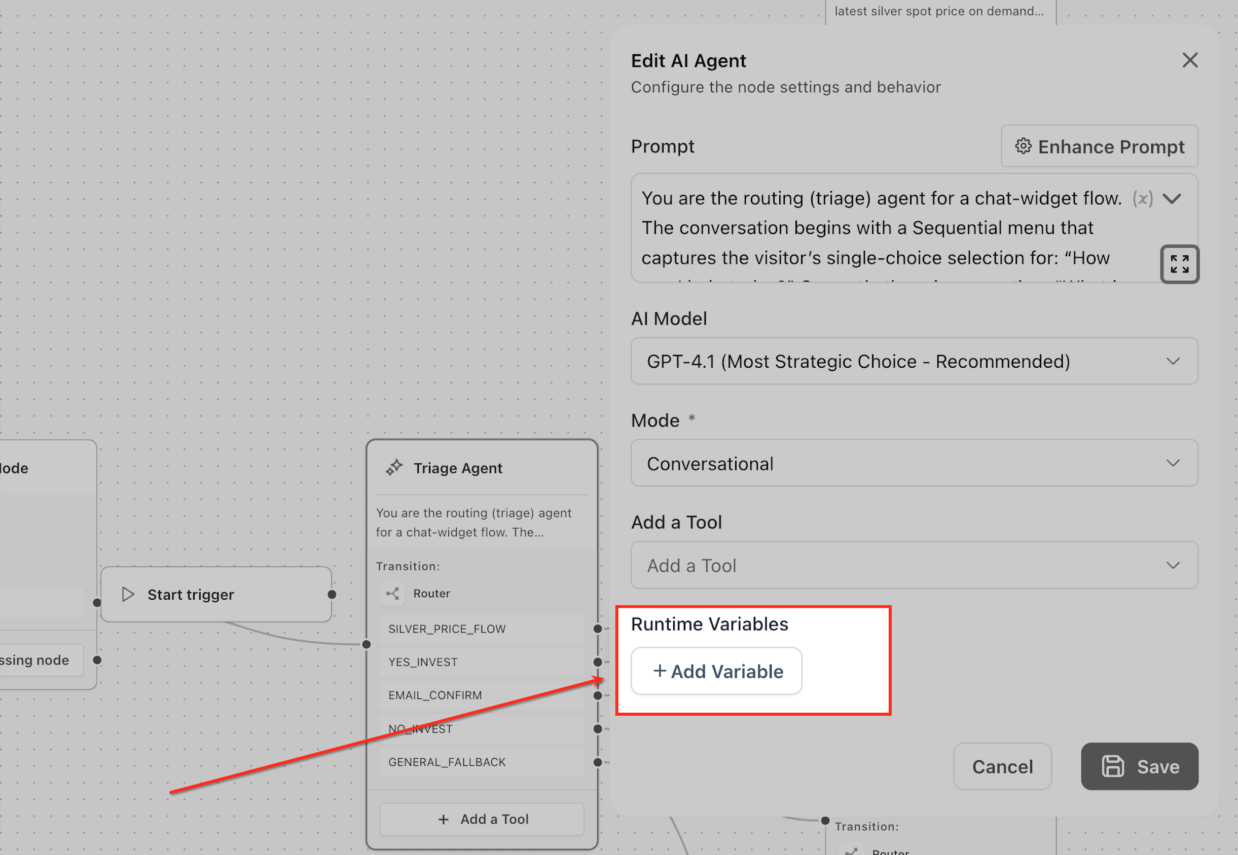 Create runtime variables to capture important data during execution, such as user name, email, or requirements. This data can be used in later steps of the agent flow.