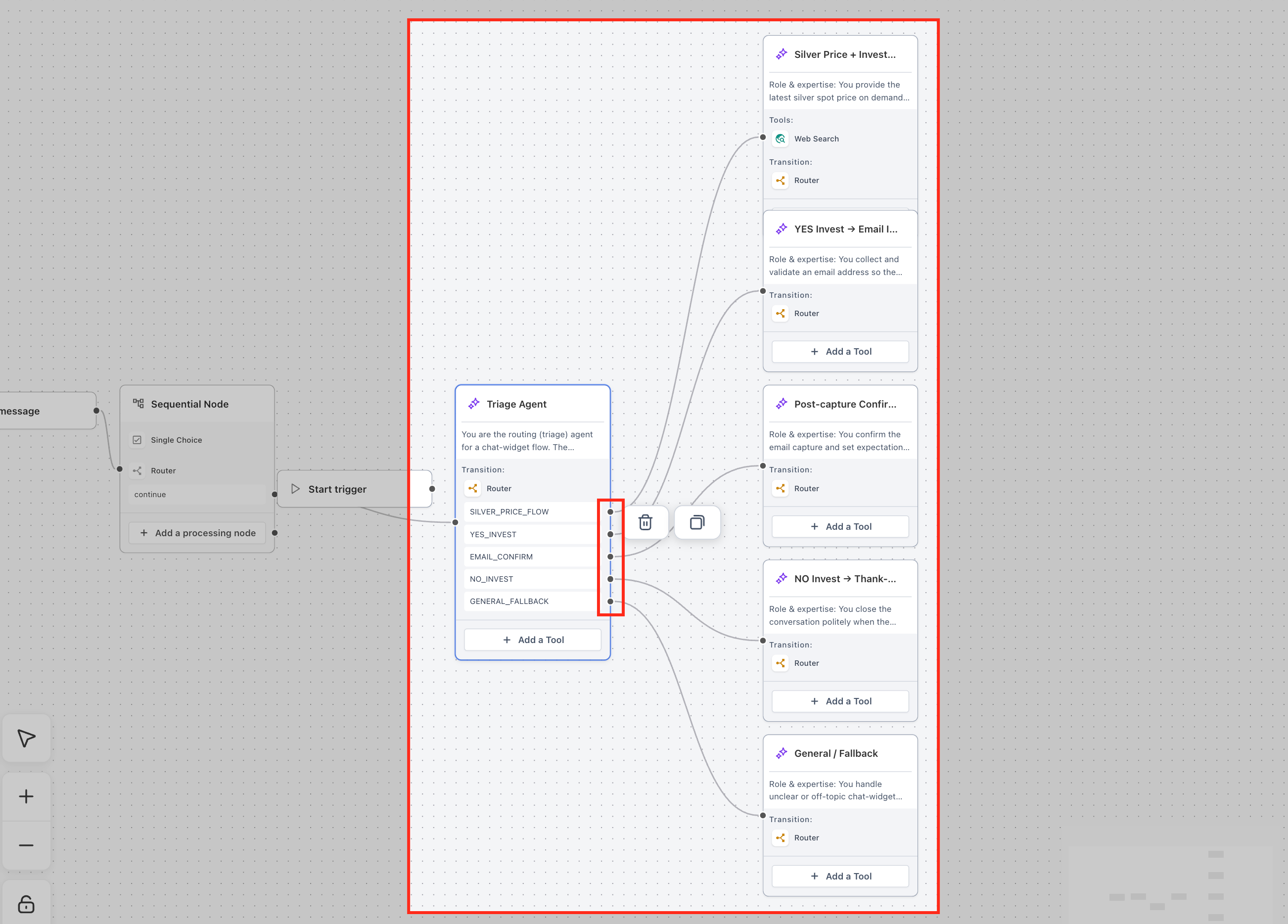 This allows the agent to combine decision-making with execution in real time. For example, when a user asks, “Do you support international payments?”, the agent can use the Knowledge Base tool to retrieve accurate information before responding, or use the Router tool to direct the flow when user intent is unclear.